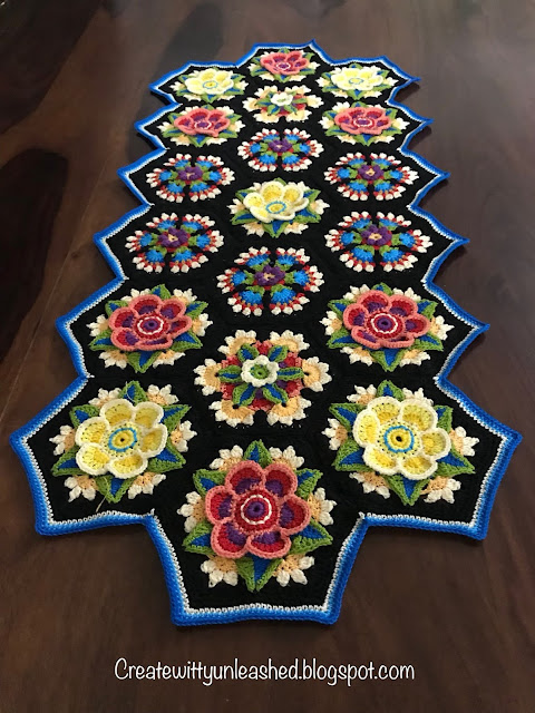 Here is my colorful crochet table runner that I made last month. I posted it on my Ravelry account. I am a member of a group that was having a two month event to make something colorful for the home. A table runner was due and I was inspired to not only join but also complete in time:)