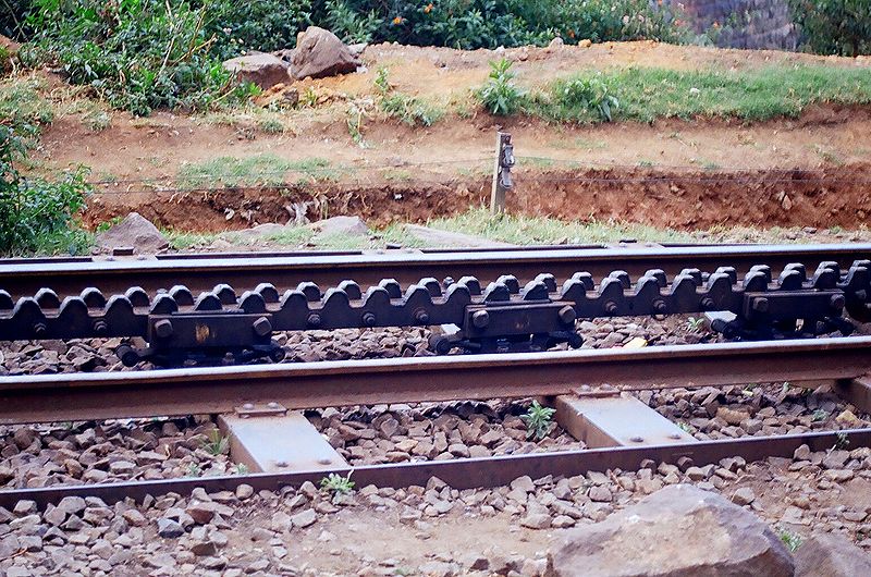 | The rack and pinion which prevents the train slipping down the track while climbing |