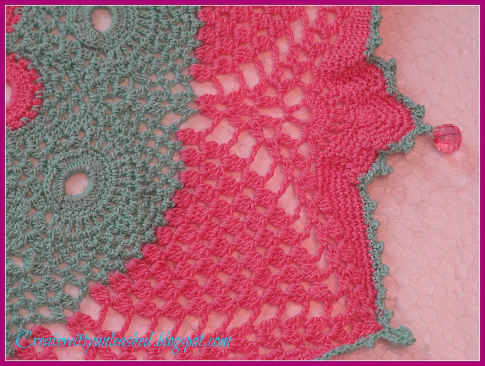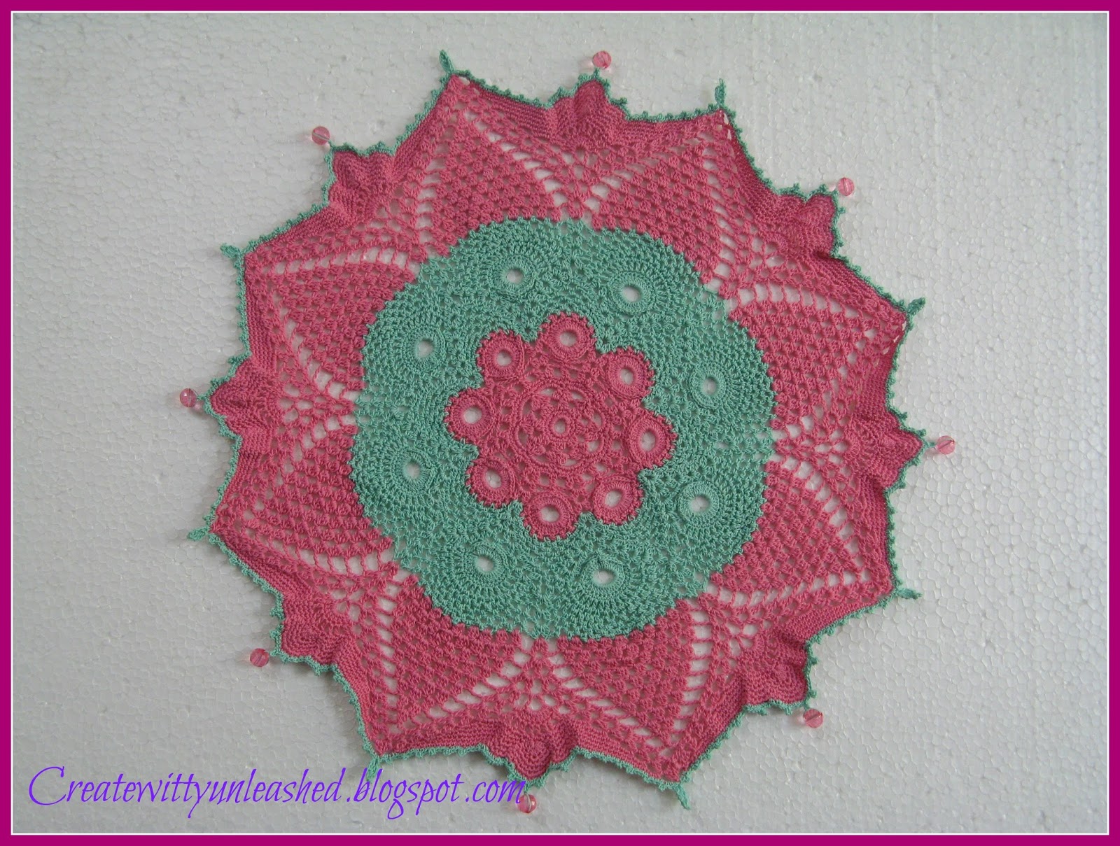 Just wanted to share one more doily named as ‘Sunburst’ from the book , ‘Stellar Beauties’, Leisure Art publications . I made it with Anchor Red heart size 20 mercerized crochet cotton and hook 1.5 mm . It measures 18 inches across . I also added pink acrylic beads on few picots on the outer circle :)