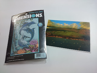 I received this Dimensions Dolphin kit from my lovely and generous friend, Rosey from Ishkabibble :) Thank you Rosey!! I love reading Rosey's posts , they are fun !! She likes to crochet , cross stitch and also tatting . Gardening is her gym and she has got world's biggest snow ice-cream factory :) She also sent me a card with picturesque Hawaii island where she found her most-wanted Souvenier , her husband :) I am looking forward to stitching on this chart soon but as you know moods and weather in a stitcher's life keep on changing very fast but I will try my best since this is a kit and I just need to start stitching .