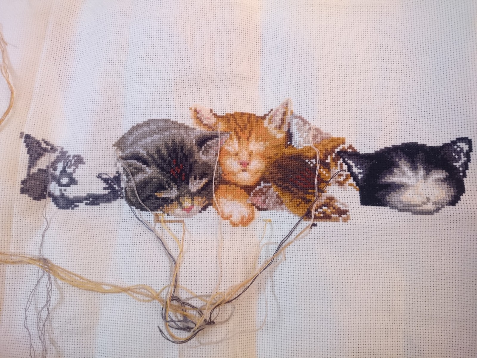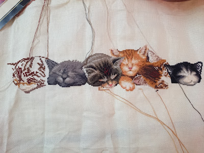 Anyways , I made some progress on my Dimensions kitty litter project and I have decided that first week of each month I will stitch this project only . Only by doing so will I get this done . So here is my April progress .